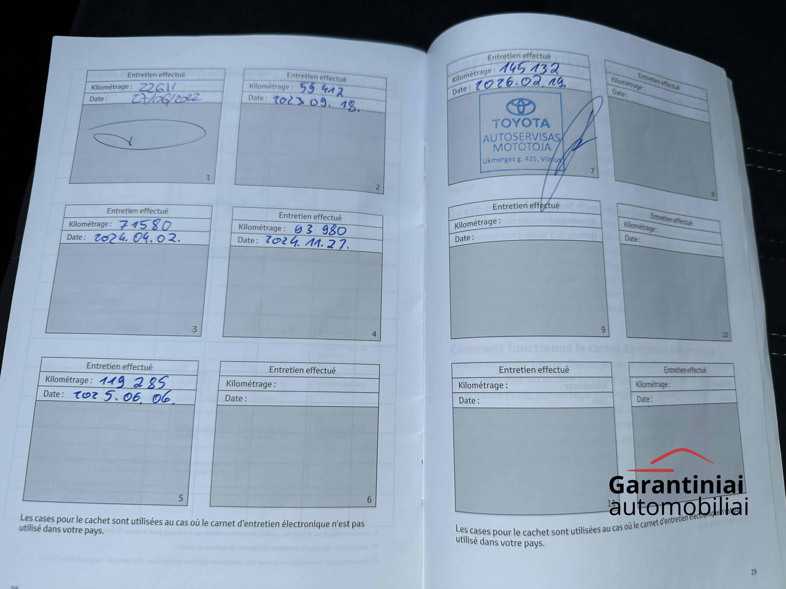 Automobilis pirktas ir prižiūrėtas Prancūzijoje. Atliktas techninis aptarnavimas Toyota atstovybėje. Pratęsta Toyota Relax garantija iki 2031 m. arba 185.000 km
