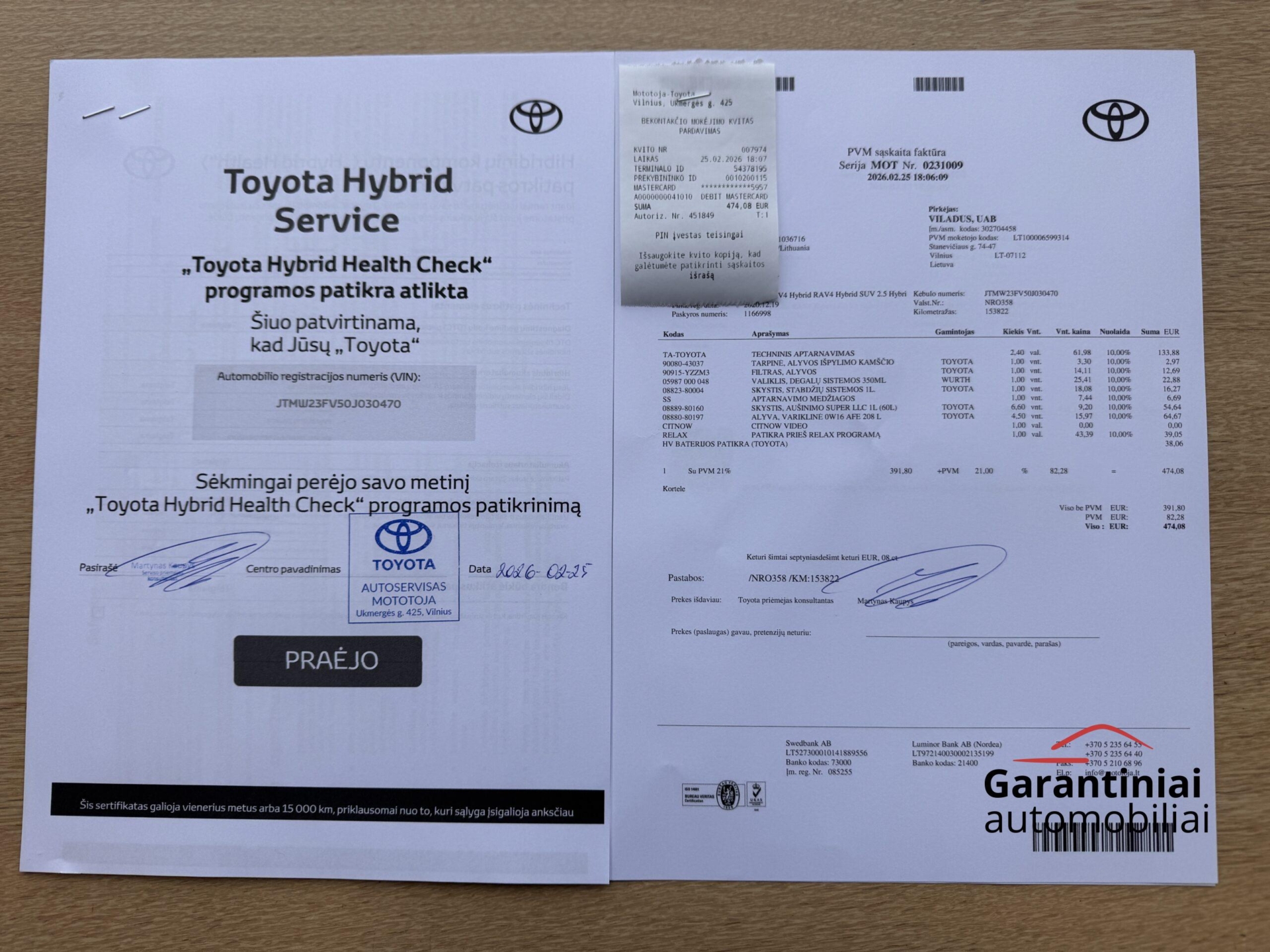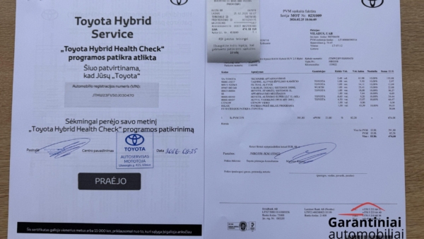 Automobilis patikrintas Toyota servise, atliktas techninis aptarnavimas ir pratęsta Toyota Relax garantija su galimybe pratęsti iki 10 metų arba 185.000 km