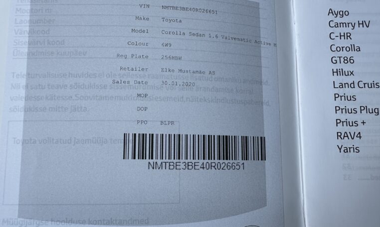 su PVMToyota Corolla 1.6 Active M/T 2020 m. su galiojančia pratęsta Toyota Relax garantija.