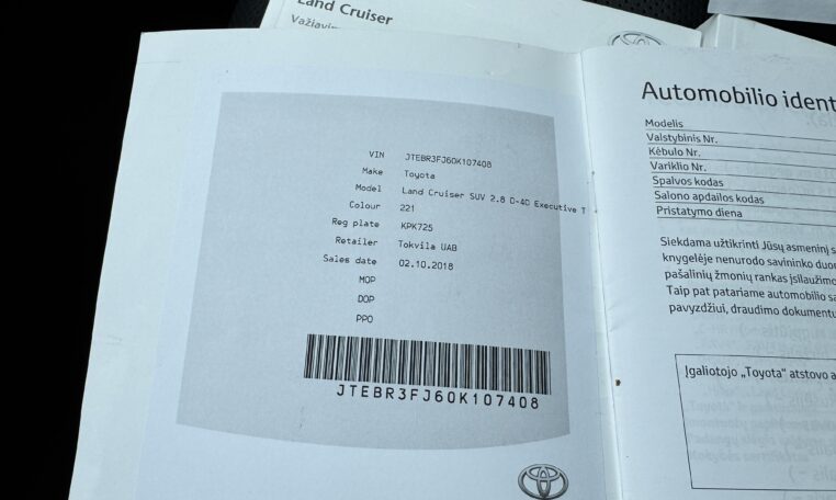 Galiojanti pratęsta Toyota Relax garantija su galimybe pratęsti iki 10 metų arba 185.000 kmToyota Land Cruiser 2.8 D-4D Executive su Technology paketu 2018 m.